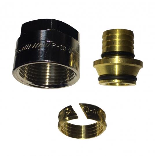 ¾ műanyag csőcsatlakozások PE-X, PB- és alumínium kompozit csövekhez. Alkatrészek: tömlőcsatlakozó, tömlőszorító gyűrű és G 3/4 kónuszos biztosítóanya.